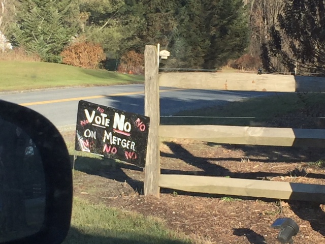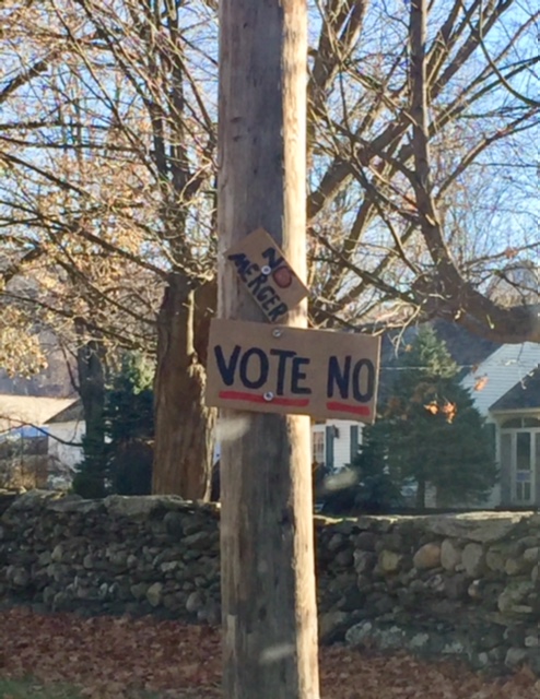 If you harbor any doubt that our two towns are a bit -ah- conflicted about the school merger vote today, all you need to do is take a little sightseeing tour of the area. The signs are everywhere. Literally.