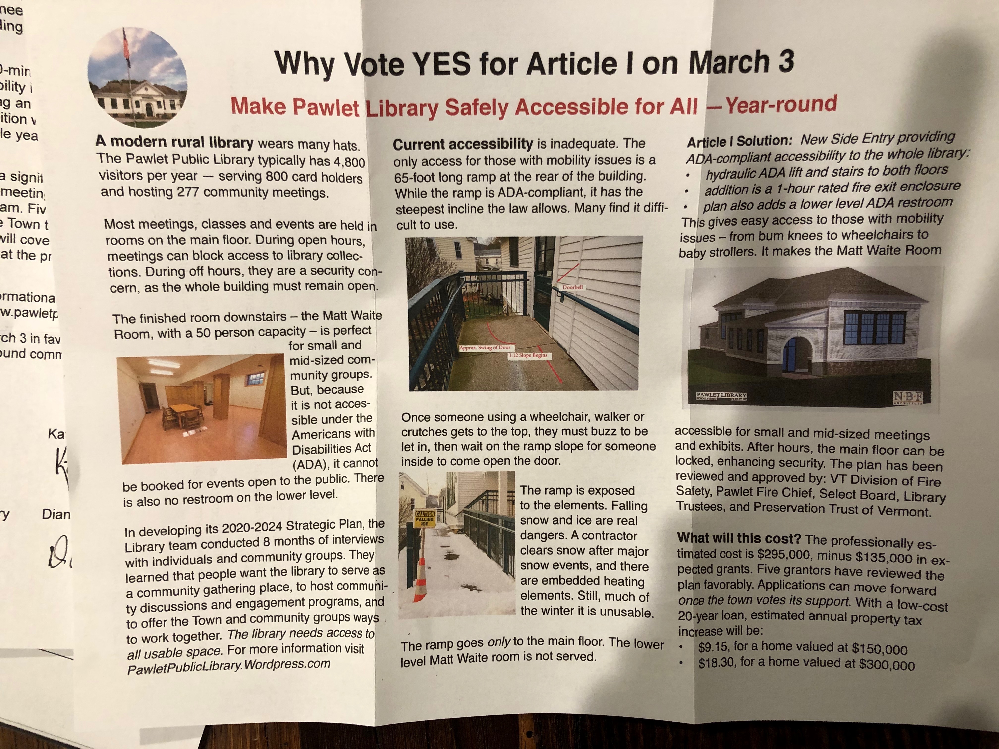 I’m happy to spread the word that the Pawlet Library Board is hosting an informational meeting about the $300,000 proposed elevator project, which will be on the town ballot for the March 3 vote.
