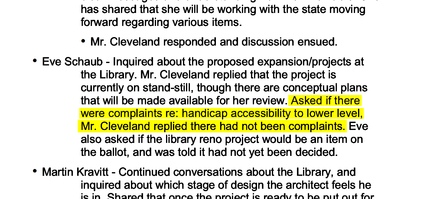 3. No one had ever complained about access to the lower level room. I know because I asked at the Select Board meeting of Dec. 18 2018 and it is recorded in the minutes of that meeting. It was only several months after that fact was pointed out that reportedly two letters of complaint materialized.